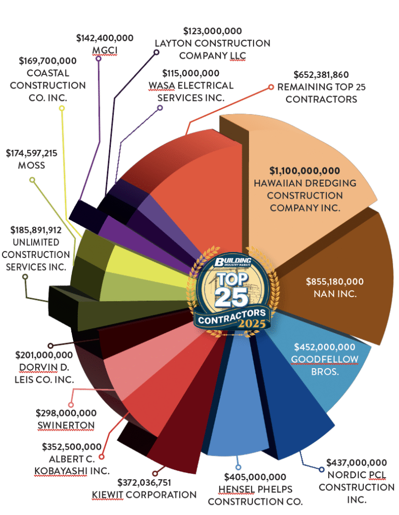 Editor’s Note: Frank V. Coluccio Construction Co. Inc. and Alaka‘i Mechanical Corporation declined participation in the 2025 Top 25 Contractors survey. Both companies had placed in the rankings in 2024.
