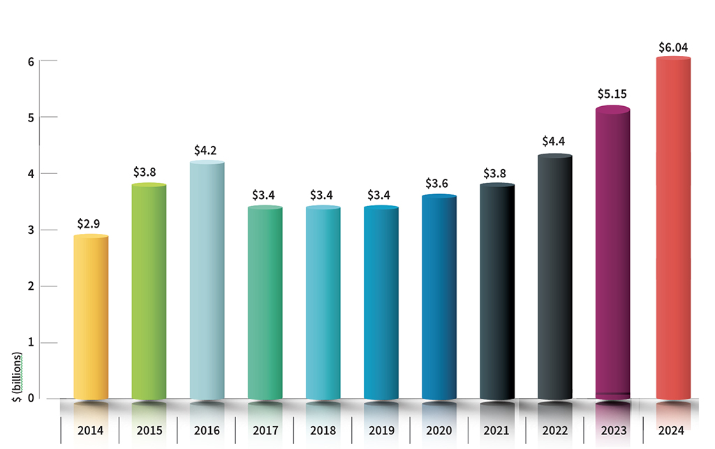 This translates as a total haul of $6,035,627,738 in 2024 versus 2023’s total of $5,147,065,664 — an $888.6-million jump.