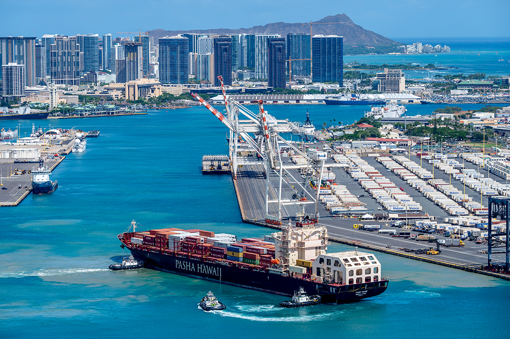“For the first time ever,” he stresses, “Pasha Hawaii and Hawaii Stevedores Inc. has partnered with [Hawaiian Electric Co. and worked with HDOT’s Harbors Division] to design and construct a modern container terminal … equipped with capabilities to provide enough power to the cranes when the threat of a natural disaster takes the city’s power grid offline.